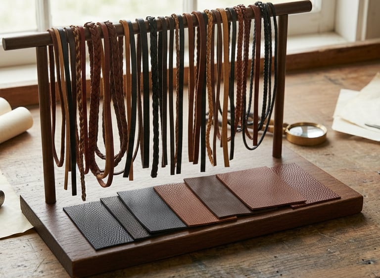 We also incorporate selected natural leather, adding an organic, elegant touch to our designs. Its unique texture gives each accessory a distinctive character, reinforcing the handcrafted nature of our work.